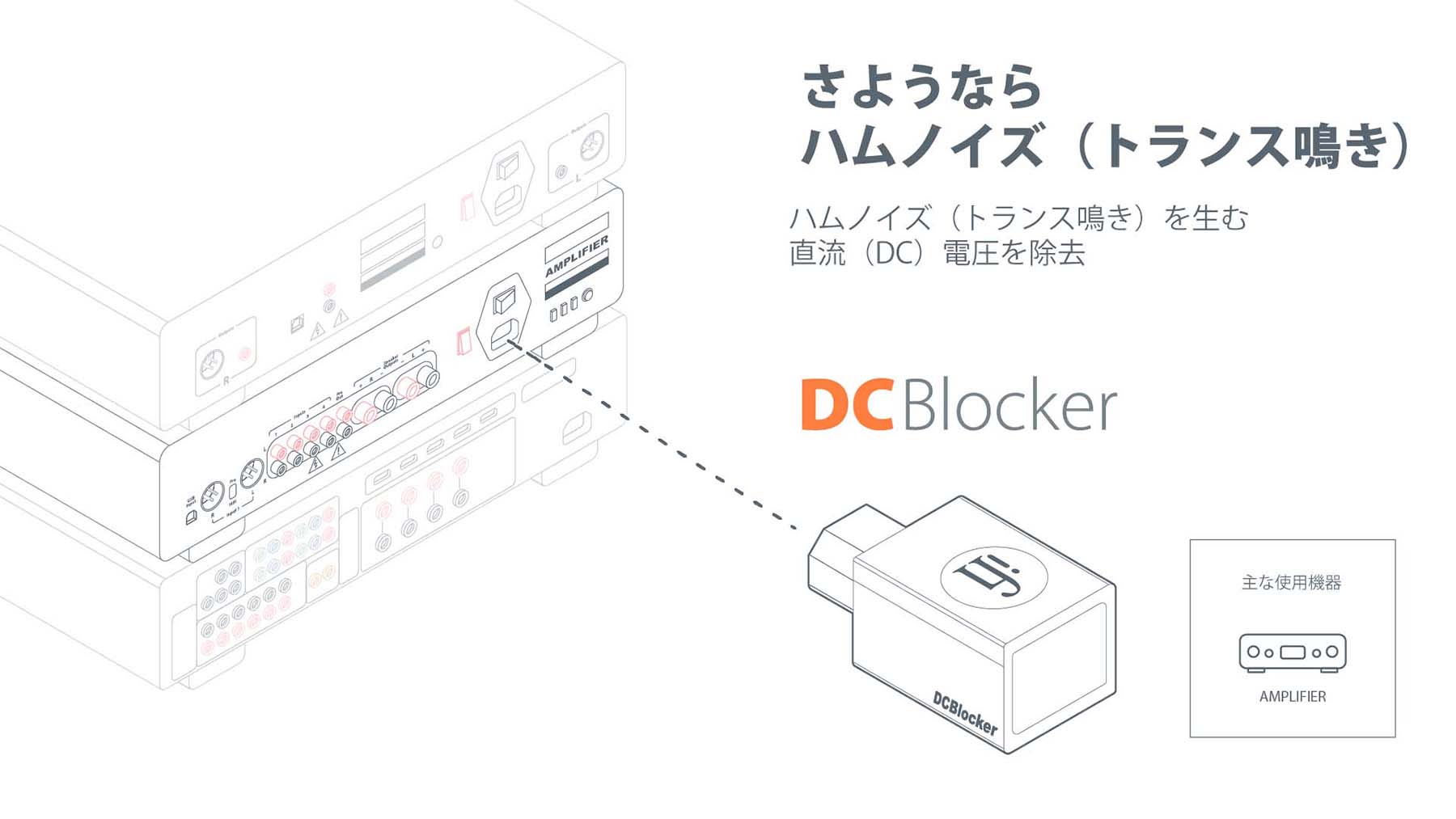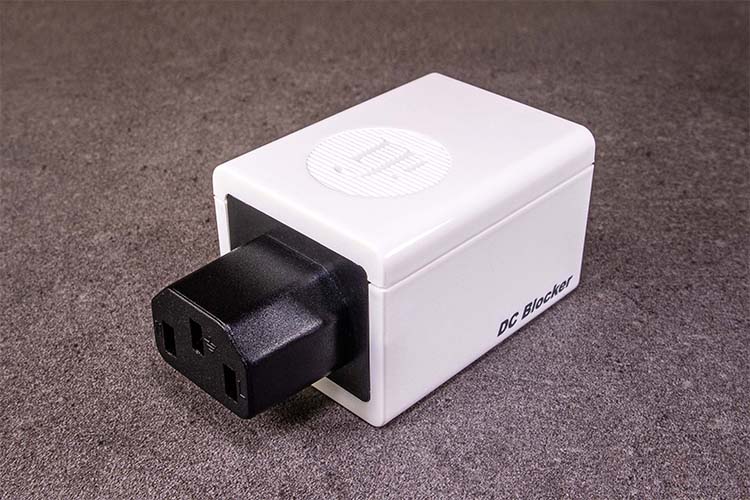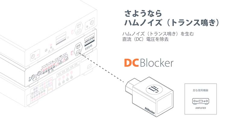 DC Blockerは、機器の電源インレットに設置する巧妙なアイテムで、その名の通り、直流(DC)電圧がアンプに侵入するのを阻止します。そのため、アンプのトランスによるハムノイズ、トランス鳴きを除去することができます。