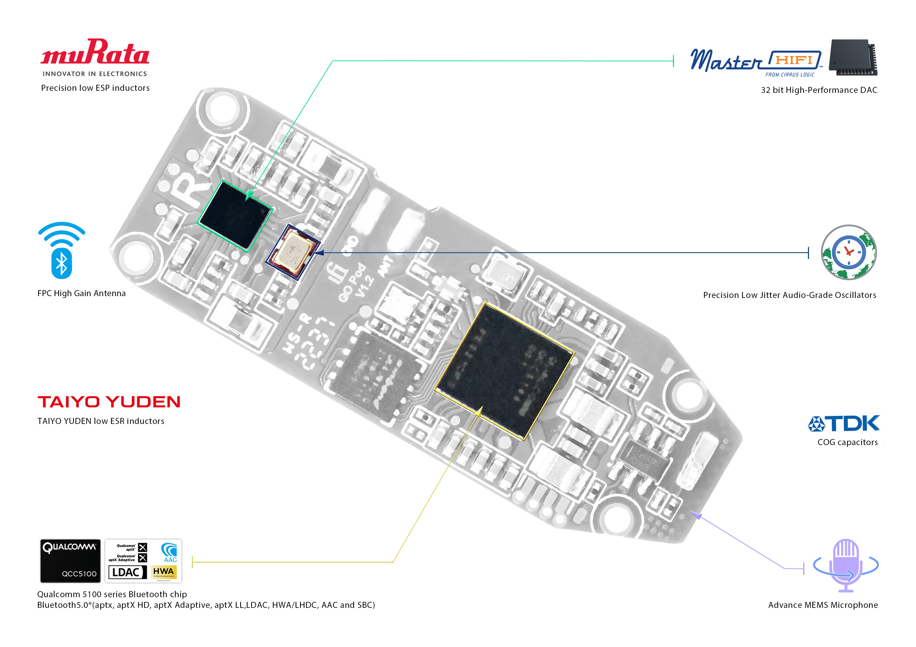 そのために、GO podはシーラス・ロジックのMasterHIFIチップを2個 — 左右にひとつずつ — 使用しています。この32ビット・ハイレゾDACチップは、GO podの回路設計においてシングル・チャンネルのDAC信号変換に充てられており、ジッターを低減する精確なクロックと組み合わせて、超低ノイズと幅広いダイナッミック・レンジを実現します。これこそが、GO podがトゥルー・ワイヤレス・イヤーバッドよりもさらに良い音質を解き放つ、鍵となる理由のひとつなのです。