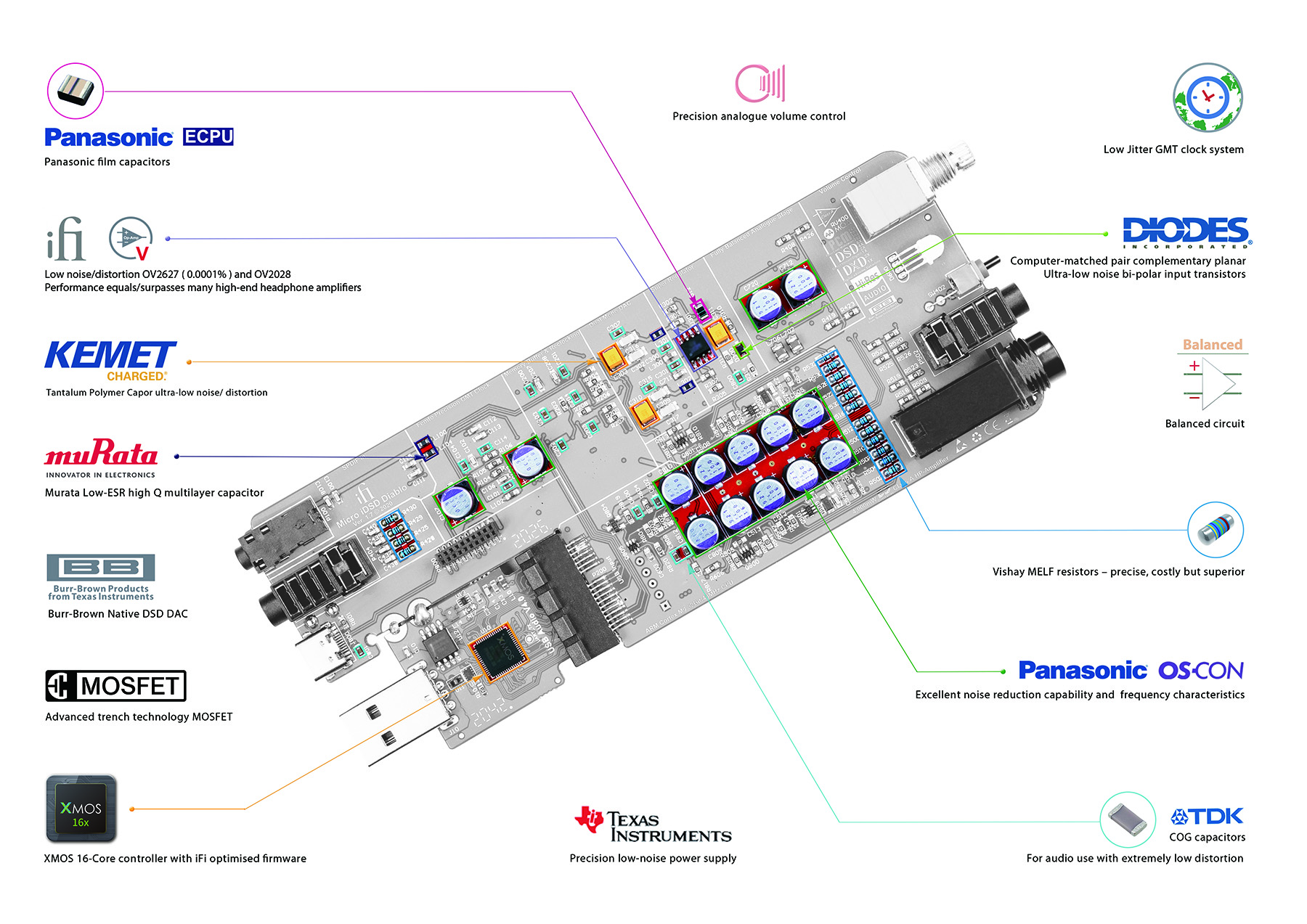 iFiの他の多くの製品と同様に特製のOVシリーズ・オペアンプを搭載しています。このトップレベルの部品が、超低ノイズ、低歪み(0.0001%)、広帯域を実現するのに貢献しているのです