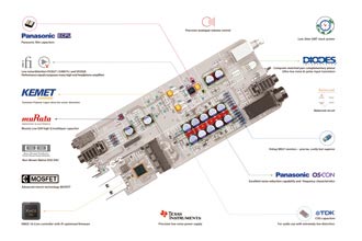 トータルで5,410μFのパナソニックのOS-CONが非常に低いESR(等価直列抵抗)、優れたノイズ低減能力、周波数特性を実現します。電解質が固形なので、OS-CONは長寿命であり、低温時のESRの変化もほとんどありません。