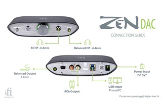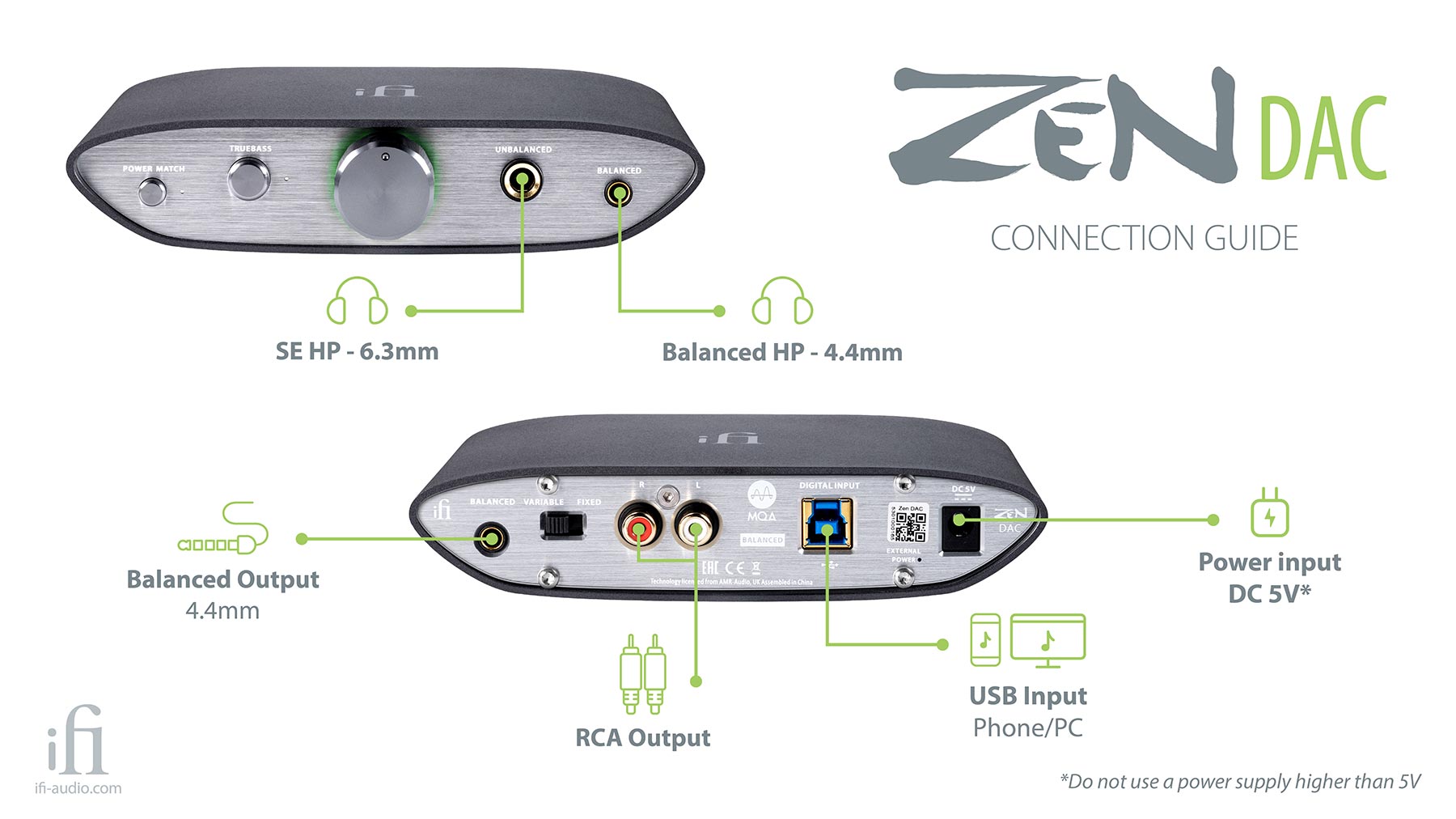 ※ZEN DACはバスパワーで動作します。モバイル端末での再生で電力が不足する場合は5VのACアダプターをお求め下さい( 純正品iFi iPowerⅡ 5V をお勧めします)
